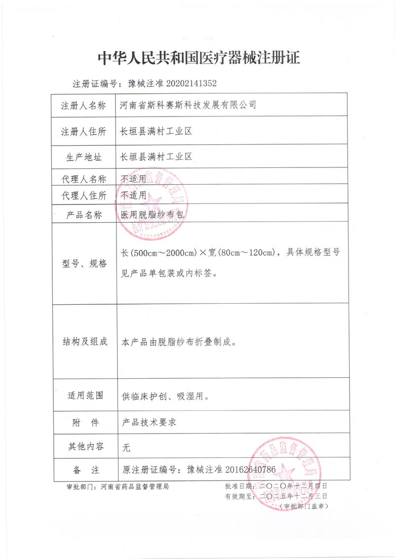 河南省斯科賽斯科技發(fā)展有限公司創(chuàng)建于 2011 年,位于“中國醫(yī)療耗材之都”- 河南省長垣縣,西臨 308 省道,南靠新菏鐵路,北依長濟高速,交通便捷,經濟發(fā)達,環(huán)境優(yōu)美。斯科賽斯積極進入醫(yī)療健康和服務領域,秉承為用戶創(chuàng)造價值的理念,專注于醫(yī)用耗材解決方案的研發(fā)和運營,并為用戶提供完善的產品解決方案;  斯科賽斯主要生產醫(yī)用麻醉系列、醫(yī)用高分子系列、醫(yī)用敷料包系列、醫(yī)用無紡布系列、醫(yī)用防護系列、醫(yī)用脫脂棉系列、生物材料制品類等七大類、100 多個品種、400 多個規(guī)格的產品。公司占地面積約 30000 平方米,建筑面積20000 平方米,擁有 10 萬級的凈化車間總面積 10000 平方米。擁有國際先進水平的生產設備和檢測儀器,技術裝備精良,檢測手段完善,為醫(yī)療行業(yè)的不斷發(fā)展進步提供保障。公司順利通過 ISO9001、ISO13485 質量管理體系認證?! ∷箍瀑愃箞猿盅邪l(fā)高科技新產品,力爭在醫(yī)療器械關鍵領域取得技術和研發(fā)的重大突破;立足國內和國際兩個市場,逐步實現(xiàn)管理理念、經營機制、人力資源、技術、產品、市場等全方位對接,提高企業(yè)的核心競爭力;過去的歲月里,斯科賽斯砥礪前行,誠信務實,銳意進取,不斷創(chuàng)新,用自己的睿智和辛勞,以富有責任感的使命,在探索中追求,在追求中超越,致力于成為值得信賴的醫(yī)療用品生產企業(yè)!在未來的日子里,斯科賽斯將一如既往豪情滿懷,信心百倍,攜手并肩,執(zhí)著追求,向更高的的目標前進,鑄造新的輝煌!